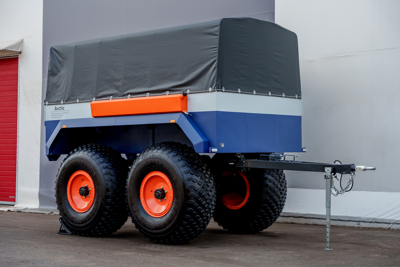 Прицеп на шинах низкого давления оснащен металлической платформой с откидывающимся задним бортом, которая пристыкована к раме через демпфирующие подушки.
